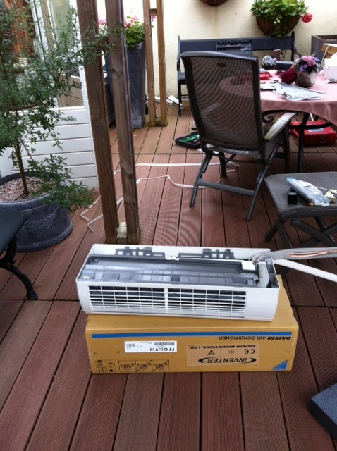Klokslag half 10 kwamen de heren om de airco te monteren. Ik weet niet hoe dat bij jullie gaat maar ik zie ze graag komen maar ook zo graag weer vertrekken.